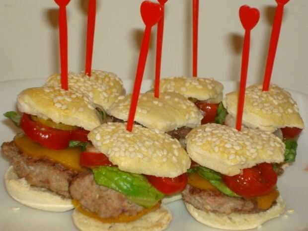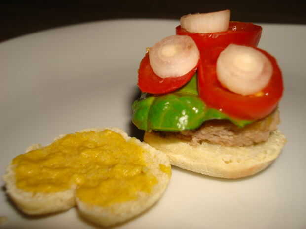 Se puede ver en el cuadro que agregar tres rodajas de tomate y cebolla a la hamburguesa porque eran demasiado pequeños, por eso creo que una poco más grande de tomate y cebolla de verdeo habría funcionado mejor y hubiera sido más fácil de montar.
