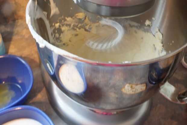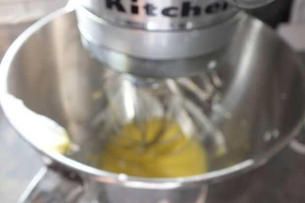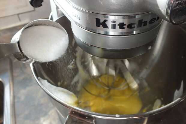 Cuando han aligerado, añada el azúcar y continuar batiendo hasta amarillo claro en color, otro 3 minutos.