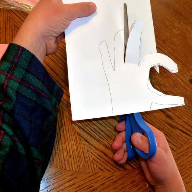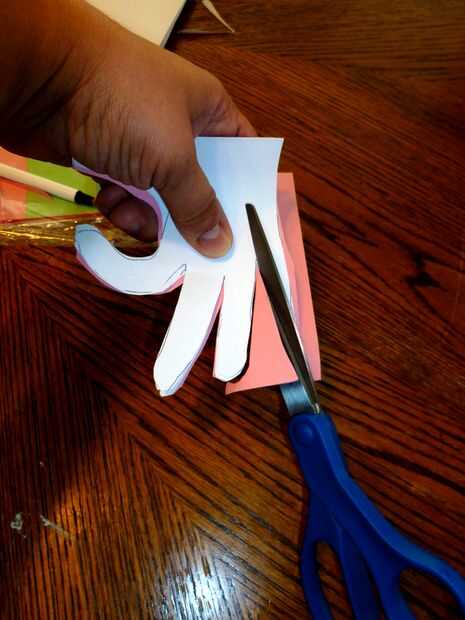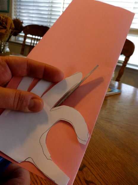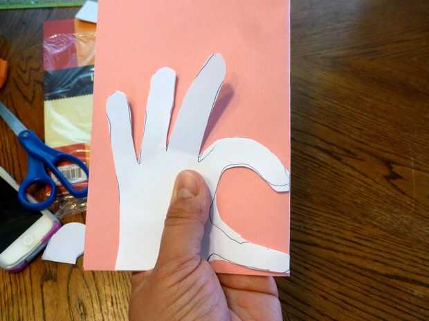 Me pareció que la manera más fácil de cortar los dedos cortar una línea recta en la parte superior de la zona del dedo y cortar de ese lado del papel. Una vez que el cuelgue de ella, no hay para trazar alrededor de la plantilla para cortar la mano de la cartulina. Sólo sostenga la plantilla hasta el borde del doblez de modo que el pulgar y el primer dedo que hacen que el corazón se alinean con la tapa.