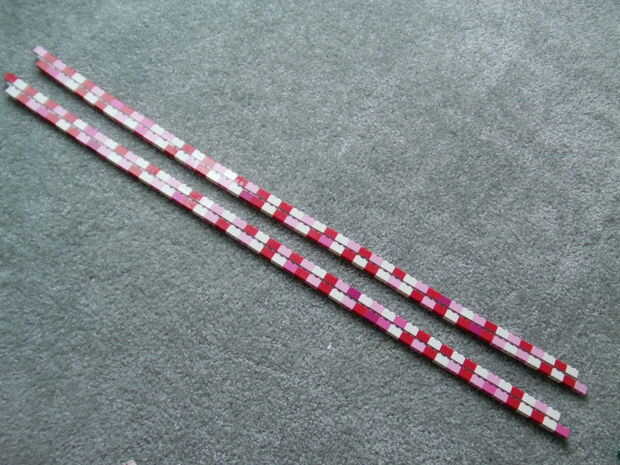 Construir una tira con dos capas de ladrillos que están escalonados para que se peguen juntos. Una vez que la tira es unos ladrillos largo agregar la capa superior. Continuar construyendo la tira hasta que cada capa es 50 ladrillos largo (100 pernos prisioneros) y ambos extremos son alternados como en la segunda foto.