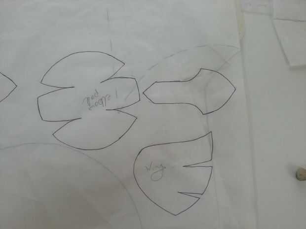 Se una pequeña hoja de papel mantequilla y ponerlo sobre su codo y dibujar un círculo o una forma ovalada alrededor de esa zona. Espesar los contornos y tiene el tamaño de su codo. ¡ Excelente! Ahora divida esa forma redonda en tercios dibujando líneas horizontales a lo largo del eje más largo, que debe dar 2 líneas horizontales a través de. Se dibujar curvas reflejadas a lo largo de las líneas que marcó (que se convertirá en el eje del espejo) y allí! Es la plantilla de codo! Esas curvas son para ayudarnos a crear esa forma de cúpula de los codales, similar a lo que hicimos para los pedazos del hombro de arco. La plantilla del codo debería verse algo como una flor deforme cuando se corta hacia fuera.
