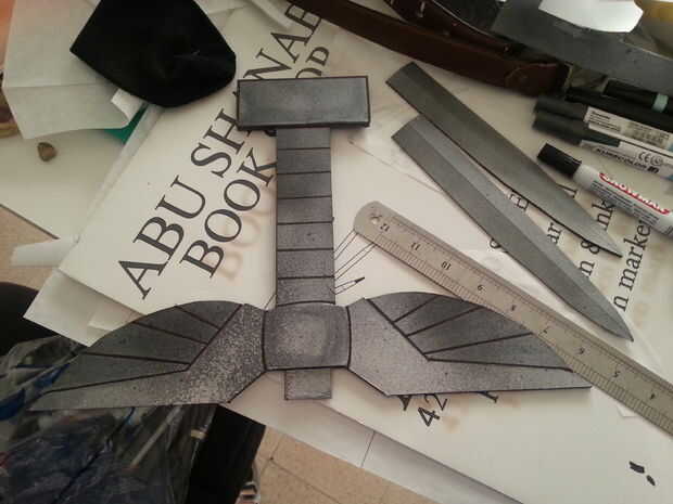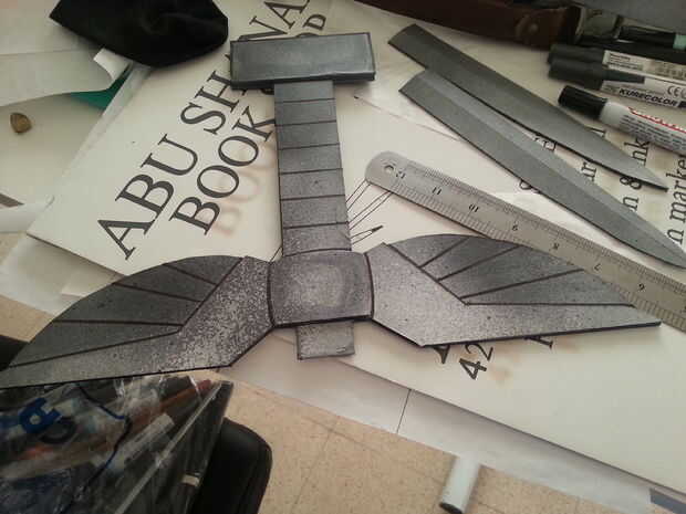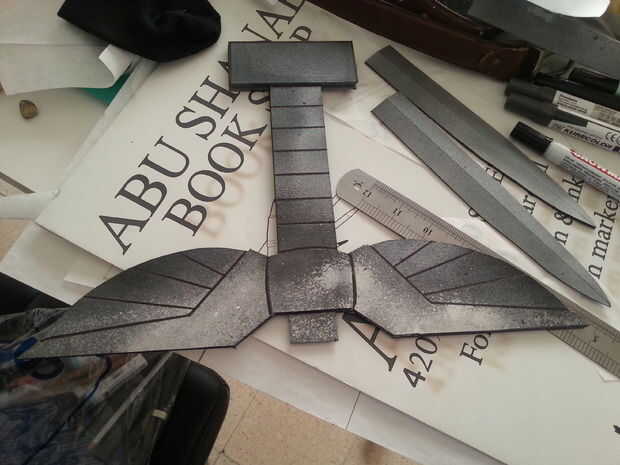 Así que cuando pinta la do de mango de la misma rutina que hiciste cuando pinta la hoja, vestirse adecuadamente y colocar periódicos alrededor del área se pintar en que debe ser al aire libre. un lado de la pintura al secarse dan la vuelta y pintar el otro lado con una base de la plata más oscuro. No te preocupes si pierdes los bordes, Contorneamos todo con marcadores negros.