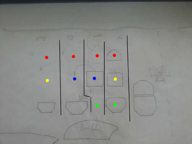 Ves en la plantilla hay diferentes formas y tamaños de piezas. Algunas piezas fueron repetidas porque tenían el mismo encaje en más de un dedo, de manera que en vez de hacer una pieza nueva que acabo de hacer la misma pieza de otro lugar. Las piezas que repiten tienen un círculo en el centro con un color determinado, los lugares donde he repetido esa pieza tienen el mismo círculo con el mismo color. Esta fue la plantilla de mi mano izquierda el pulgar está a la derecha de la pantalla y los dedos ir a la izquierda en consecuencia.