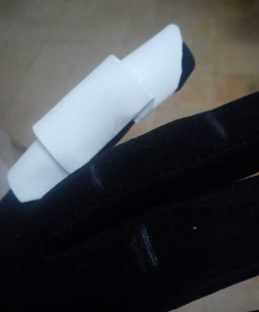 Bien, tomamos las piezas de la pinky y comenzar con la pieza superior. Poner pegamento en los laterales y la parte inferior y simplemente pegarla en lugar manteniendo su meñique derecho, envolviéndolo todo con ligera presión hasta que se seca y se pega en su lugar. Ahora no sientes nada en el dedo desde las capas que tenemos de debajo protegerá tu piel, y cuando que pedazo tiene secos en lugar debe tomar la forma y la curva del dedo.