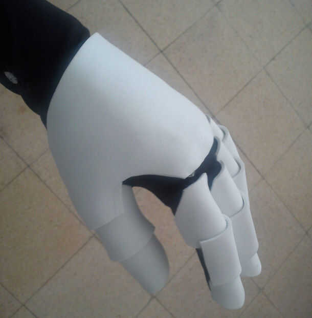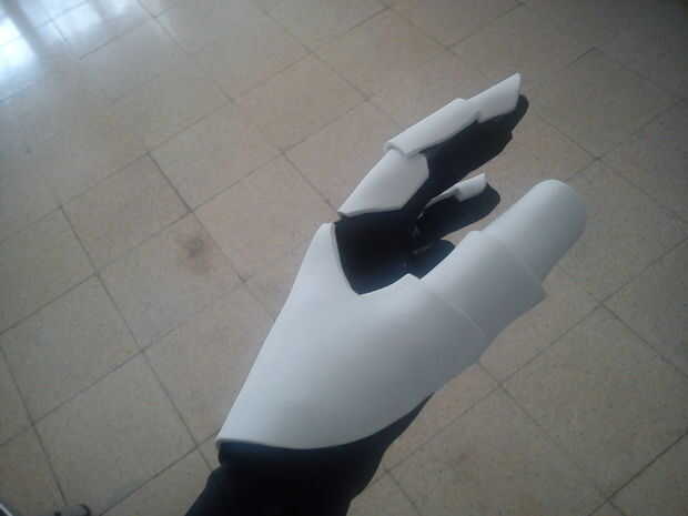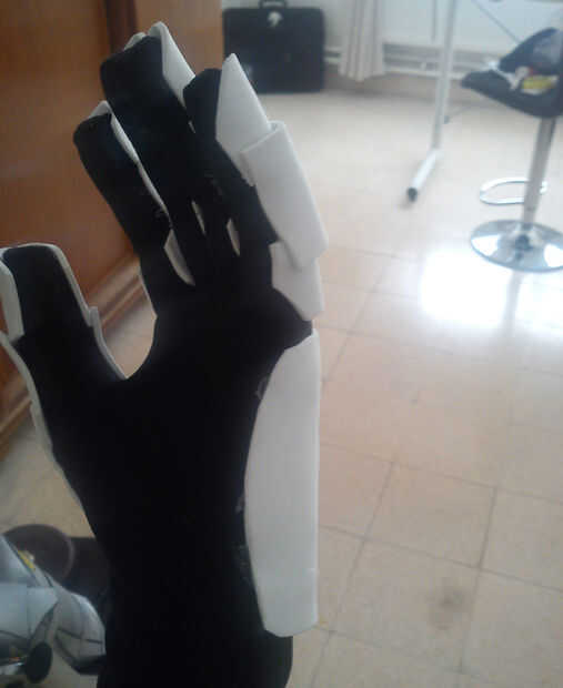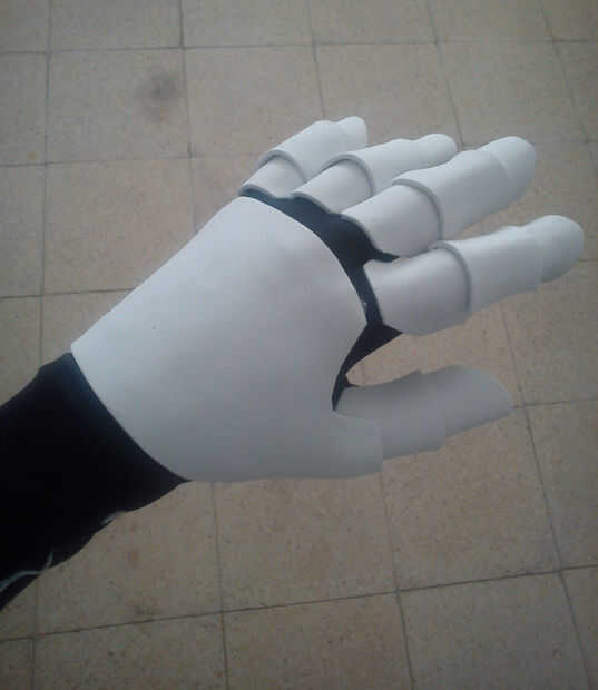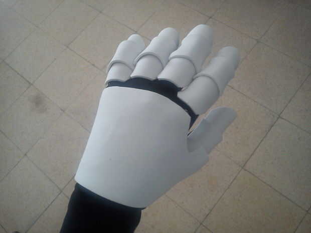 Muy bien! Después de poner su guante, vendas y luego base guante (que debe ser fácil hacer incluso con los dedos Unidos) agarras un lápiz / lápiz de color / marcador y marca dos líneas horizontales uno pasando por el centro de tus nudillos y la otra justo por encima de la muñeca, ésos son sus pautas para que usted sabría donde pegar la pieza de mano. Esto sólo cubrirá la parte posterior de la mano porque, una vez más, queremos ser capaces de agarrar cosas y mover en este. Poner pegamento en el interior de esa pieza pegarla en, sujetarlo firmemente con la otra mano y aplique algo de presión para que la espuma toma la forma de su mano. Una pieza en el lado allí debe sentarse en la parte superior del pulgar, así que asegúrese de pegar esa parte así.