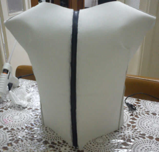 Después de probar por primera vez y asegúrese de que cabe cómodamente y puede mover su cintura, brazos, cuello... etc. quitar y empezar caliente-pegando todos juntos. Ahora Asegúrese de que está todo como aseado posible, ninguÌ n pegamento hacia fuera las costuras. Y no te preocupes si mira un poco descuidados si las capas no son montaje exactamente uno al otro porque puede cortar los pedazos adicionales de y área será cubierto por las hombreras (pedazos del hombro) que cubriremos más adelante de los hombros.