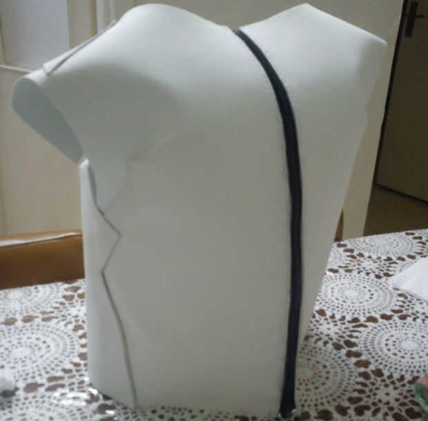Para obtener un ajuste perfecto, coloque ambas piezas sobre su pecho y poner los tirantes de la parte delantera en la parte superior de la parte posterior y marcar la línea donde intersectan. Asegúrese de que usted darse un pequeño espacio para respirar, no tire demasiado apretado alrededor de la armadura o no ser cómodo en él. Armaduras de espuma de artesanía son muy calientes ponerte para salir de un área pequeña para que entre aire, sería más cómodo de llevar en todos los casos. También, marca la línea donde la curva de la parte delantera cubre la parte trasera a ambos lados. Después de marcar las líneas utilizan alfileres para prender las piezas del conjunto de los hombros y los lados. Esto es para probar el ajuste antes de usar pegamento en las piezas. Si desea utiliza el pegamento caliente y desordenar y quitarlo y tratar de nuevo, se deforme la espuma, que pierden su forma y grosor y se vuelven delgados y elásticos porque el calor del pegamento derrita lo. Puede ser fijo, no es el fin del mundo, pero es mejor para no cometer esos errores porque en algunos casos puede que tenga que rehacer toda la cosa... ¿y no quiere ahora le?