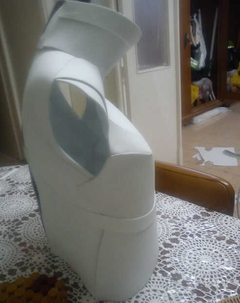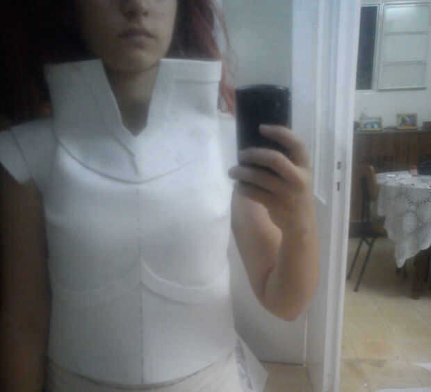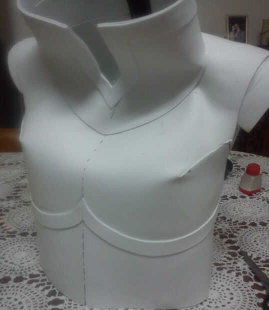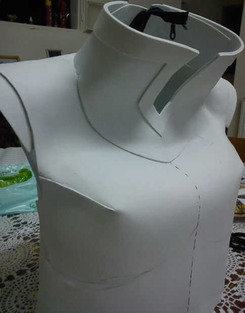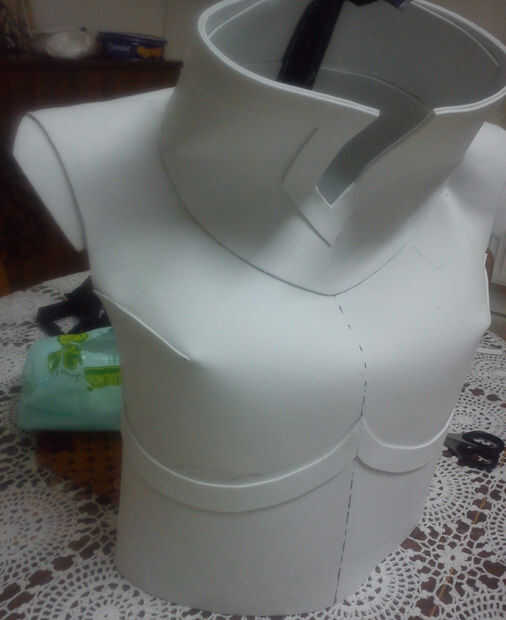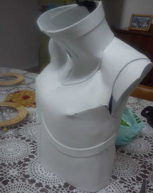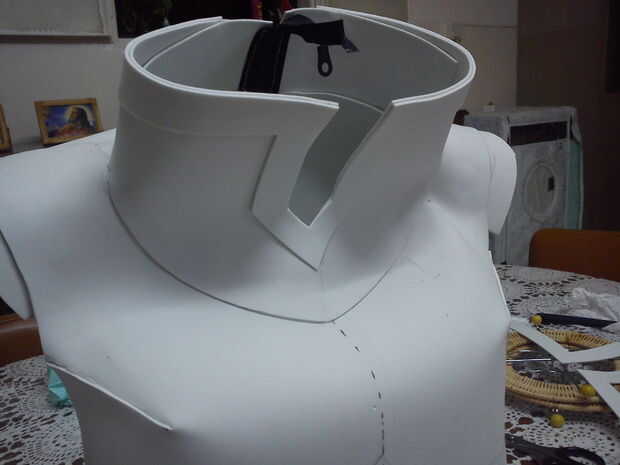 Las 3 fotos siguientes muestran cómo el detalle se encuentra en el cuello, en la quinta imagen que fue agregado el detalle en la parte inferior del pecho, ahora son realmente dos tiras curvas de espuma que se reúnen en el centro, tienen forma de "U" en la parte frontal y llega hacia arriba hacia la parte posterior y en la última foto que puedes ver cómo la pechera va a sentarse en el cuerpo.