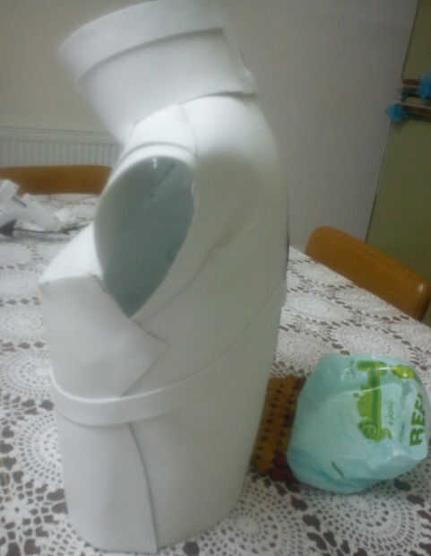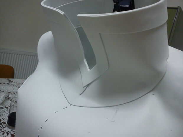 Para cada uno de ellos se corte una tira de espuma, directamente a la primera de ellas y curvado para los detalles de la segundo y terceros, y simplemente usamos pegamento caliente para pegar en el lugar. Ahora se trataba de un proceso de ensayo y error, así que me gustaría sugerir antes de empezar a recortar y perder toda la espuma tienes, hacer unos bosquejos con papel mantequilla y mantener cortarlos y probandose hasta la plantilla final perfecta y luego cortar la espuma y pegamento en su lugar. La primera imagen muestra el detalle en la parte superior del cuello.