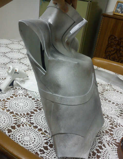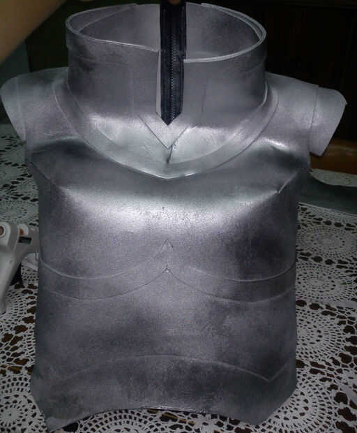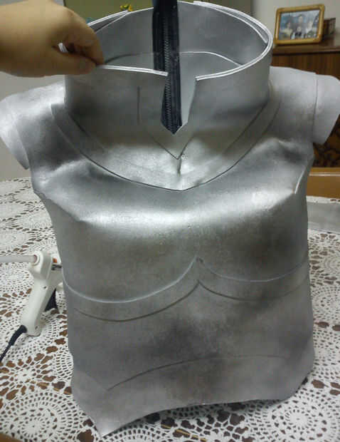 Así que después de poner periódicos por todas partes, colocar la armadura y rociarlo a distancia con la pintura plata primero en un lado, esperar un poco hasta que se seque y voltee al otro lado y repetir que hasta se ha pintado totalmente, no te olvides también de pintura el interior del collar porque va a mostrar. Después de hacer una capa o dos de plata, incluso más lejos a pie y algunos trazos negros del aerosol, no color negro... Esto sólo le dará la pintura plata algunos puntos oscuros y esto le dan más definición, trate de golpear los puntos de donde crees que debería mostrar más la sombra como por debajo de los senos, los pliegues en la espalda... etc.