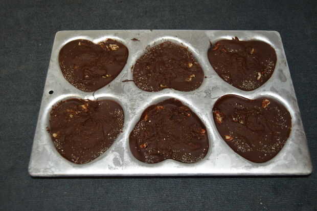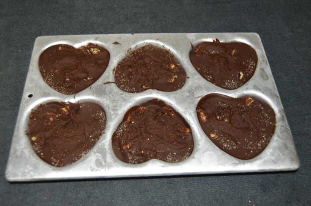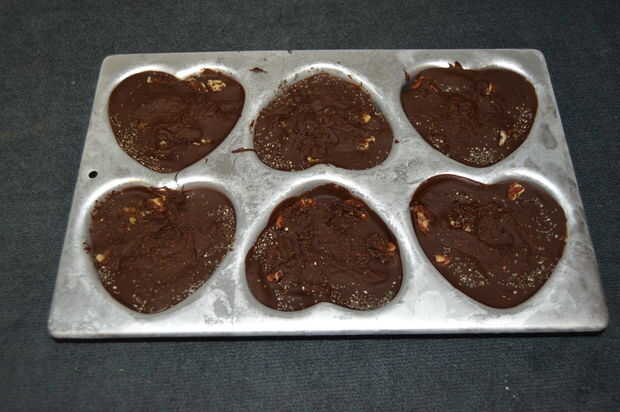 Ahora, hora de los moldes. Coloque los moldes rellenos de chocolate en una nevera o congelador por 1 hora o hasta que totalmente endurecido.