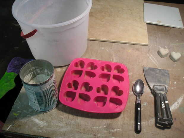 Herramientas de la mezcla habitual, baldes, agua, tazas para medir/latas, agitadores, cucharas, cemento de mezclas de diversas clases, etc..