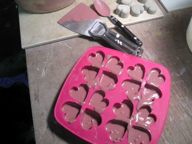 comencé a llenar los moldes hasta la parte superior. Pero más tarde preferí sólo la mitad lleno de moldes. Ahorra en la cantidad de mezcla y es más fácil de manipular. Una cuchara regular es una herramienta de buen relleno. Depende de usted. Permiten los corazones de 18 a 24 horas al menos. Trato de mezclar por la mañana y luego desmoldar la mañana siguiente.