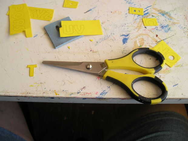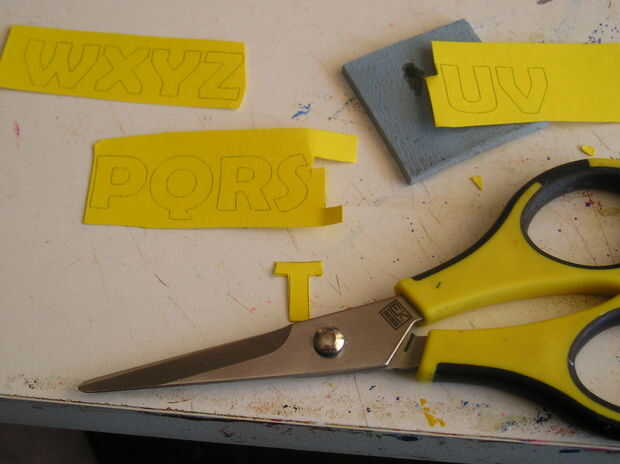 Para este paso, he utilizado el procesador de textos. Encontrado una fuente que quería utilizar y a través de ensayo y error, tiene el tamaño correcto que cabe en un corazón pero que no sea demasiado pequeño. Las letras se recortan con tijeras o un cuchillo de arte/bisturí. Compra cartas pueden ser utilizado, pero me gusta guardar ese dinero y solo recorto yo. Las letras amarillas fueron impresos en cartulina. Pero usé mucho papel bond colores 20 libras. Son más fáciles de cortar que la cartulina, y no tiene mucho aspecto de diferencia sabio.