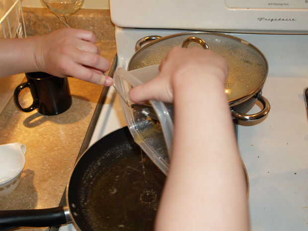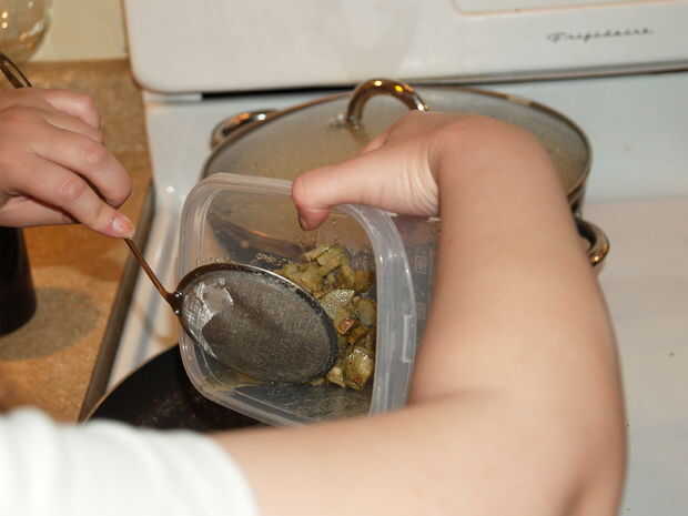 Vierta la mezcla de mantequilla y los tallos a través de un colador de malla fina, en una olla pequeña, clarifique la mantequilla y retire los trozos de tallo.  Usando el reverso de una cuchara, asegúrese de exprimir exceso mantequilla los pedazos de tallo a través del tamiz.  En mi caso utilicé el lado del recipiente y una cuchara de malla fina, pero el efecto de exprimir la mantequilla hacia fuera es el mismo.