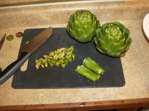 Tratar de hacer que la superficie inferior de la cabeza más plana posible al cortar, de lo contrario el plato va a quedar en la placa de gracioso.  Cortar el extremo de un tallo, lo cuarto parboil en el agua de alcachofa durante cinco minutos y rebanar los cuartos de la madre.  Si el tallo de la alcachofa es particularmente leñoso, utilice un pelador pelar lejos la capa superior de verde oscurezca, hasta la médula verde pálida en el centro.