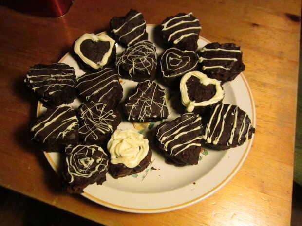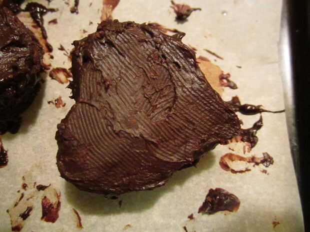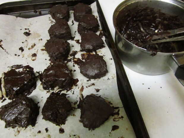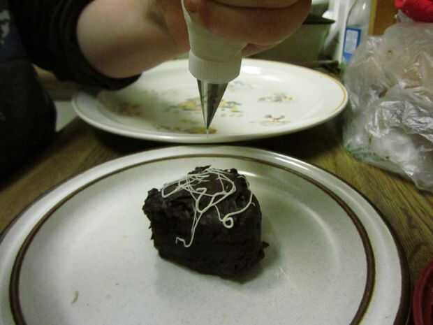 Usando un cuchillo, la cuchara o la espátula, cubrir cada uno de los brownies de chocolate y ponerlos en un preparado para hornear forrado con papel pergamino. Cuando hayáis hecho esto, colocarlos en la nevera para que endurezca el chocolate. Si está utilizando granas, frutos secos o caramelos es probablemente una buena idea para decorar los brownies con éstos antes de que el chocolate se endurece completamente, para que se peguen. Usé sólo chocolate blanco para decorar estos. Si utiliza chocolate blanco, primero fundirlo en el microondas o en un quemador y cuchara en cualquiera un piper de glaseado con una punta pequeña o una bolsa de plástico con una esquina cortada fuera. Usando esto, tubo el chocolate sobre el Brownie. Hacer creativo, diseños, interesantes o simplemente aburrido, como yo lo hice.