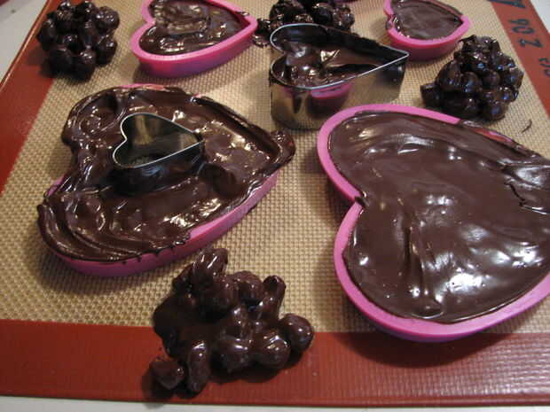 Una vez que se llenan los moldes, notará que has conseguido sobra chocolate. Puedes ya sea esto vierta sobre el helado, comer con una cuchara o descarga un montón de cacahuetes con él, darle un buen revuelo y cuchara sobre la hoja, así. (Como se muestra)