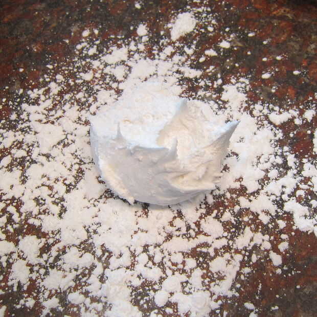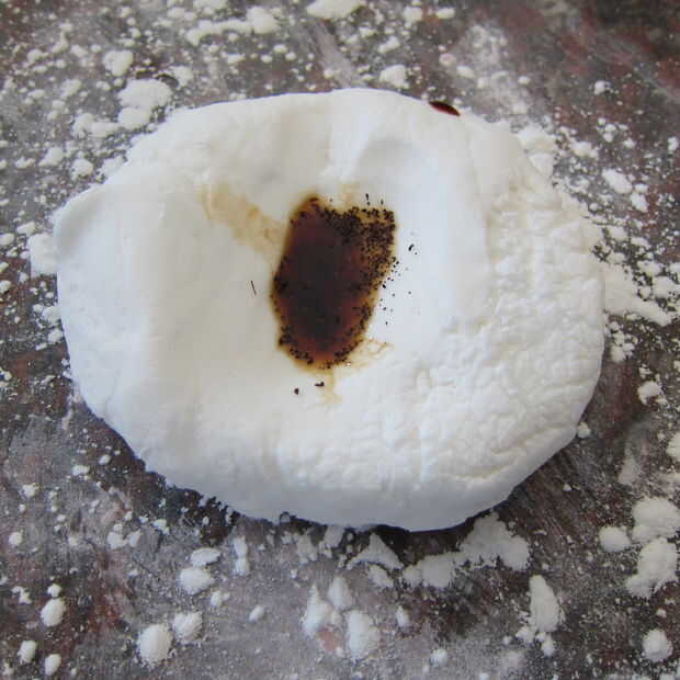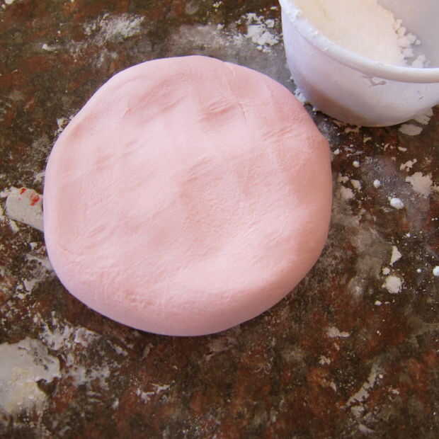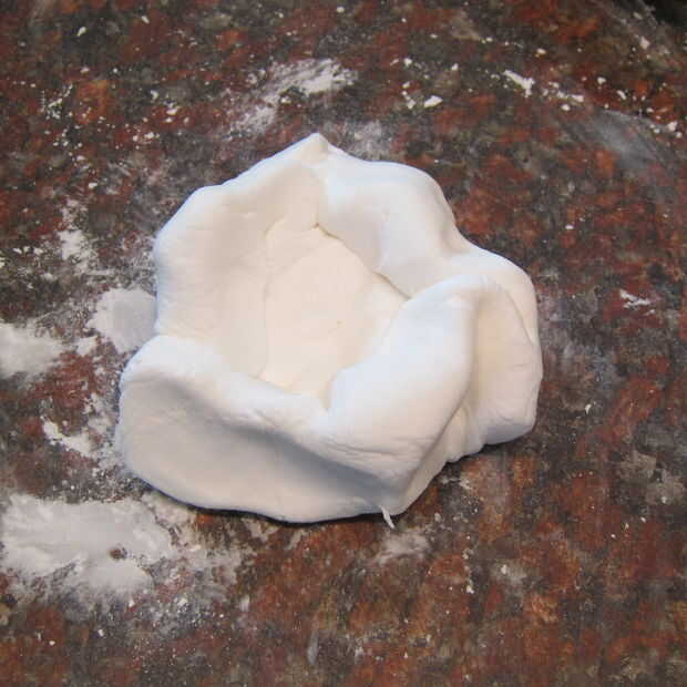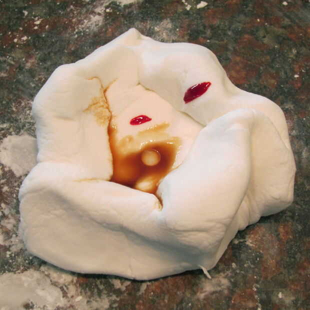 Hacer una especie de forma de tazón de fuente de una de las piezas de masa. Verter en los extractos de sabor y añadir colorante alimentario.