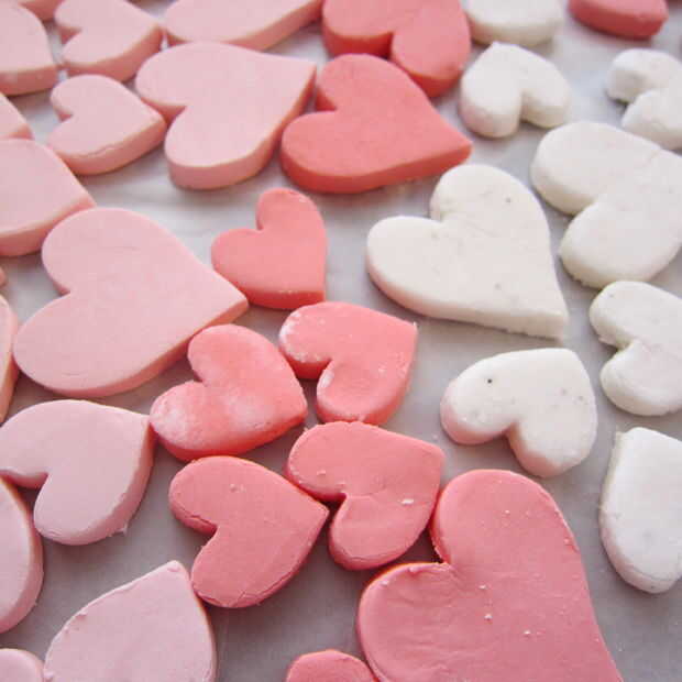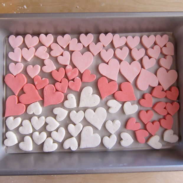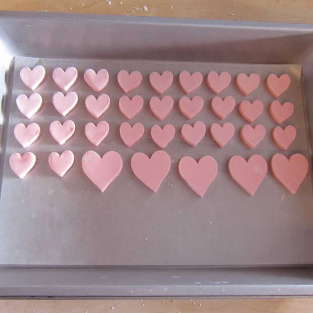 Organizar los caramelos en un pergamino forrado para hornear y dejaron secos durante 48 horas. Sé que esto es mucho tiempo pero tarda ese tiempo darles duro. Voltear el corazón de vez en cuando para asegurar un secado uniforme en ambos lados.