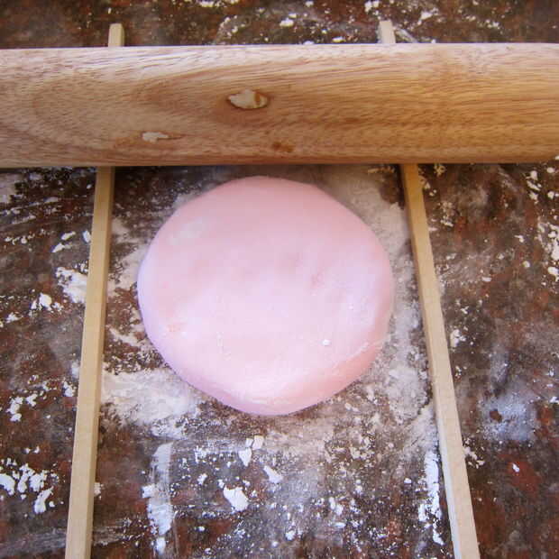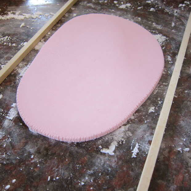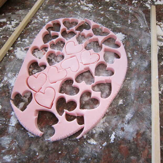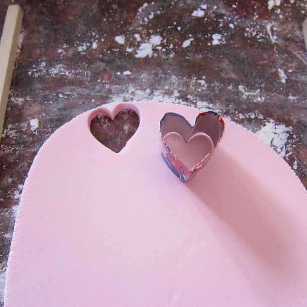 ** Me gusta usar tacos de madera cuadrada como guías para mi rodillo para asegurarse de que el espesor es el mismo en todo. Esto hará que secando incluso entre todos los corazones de caramelo.