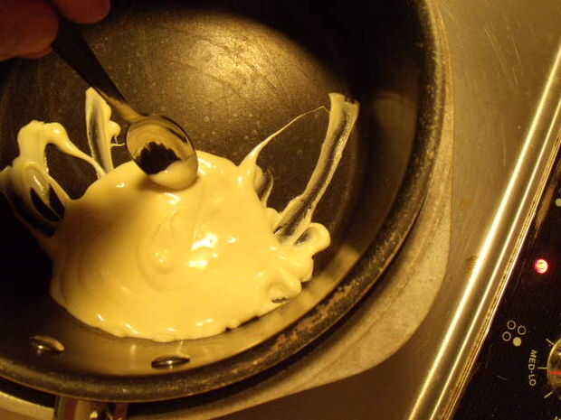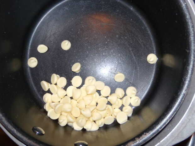 Después de cinco o diez minutos, coloque un par de trocitos de chocolate (o lo que usas) para ver si se funden. Deberían empezar a derretir inmediatamente. Si no, esperar otro par de minutos.