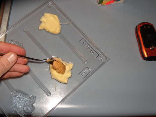 Extiende un cuadrado de papel de cera en la parte posterior. Se pegará ahora, pero cuando los chocolates se haya enfriado y endurecidos se pela derecha.