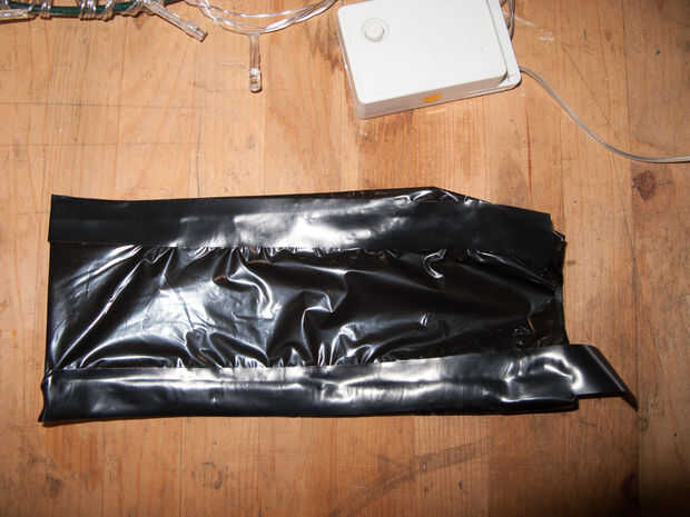 Deslice la caja de control dentro de la manga y doble en los extremos y con cinta adhesiva alrededor de los cables.