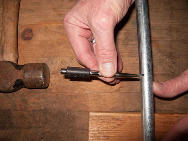 Utilizando un martillo y un punzón de acero, golpee un divot en el conducto donde los ojos del tornillo terminará siendo así que el corazón se cuelga del brazo. Esto evita que la broca resbale.