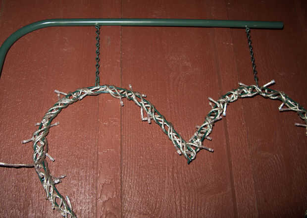 Enganche los extremos abiertos de los ganchos de s en el marco de corazón en la parte superior de las jorobas.