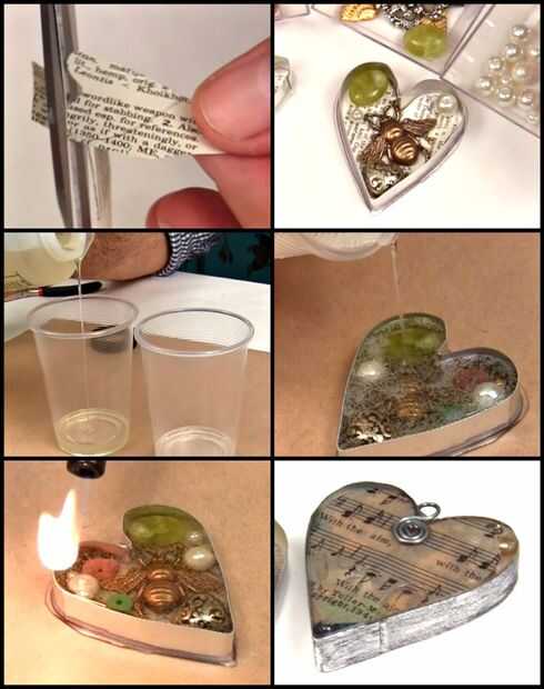 Cuando esté seco, recortar corazones de página de libro y se llenan de perlas y joyas