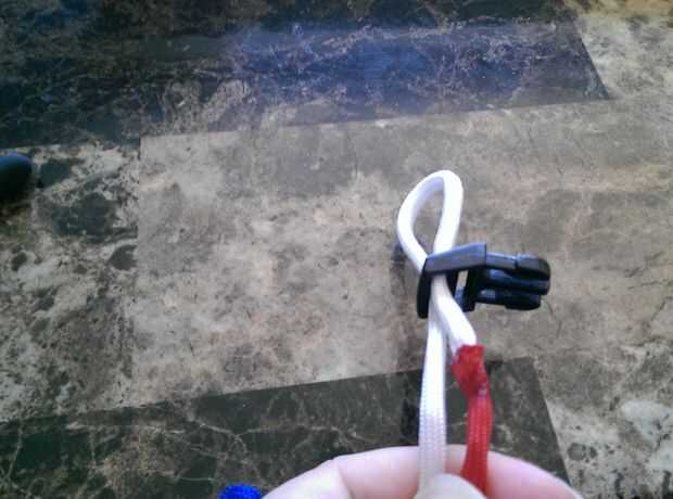 Una vez que tengas completo de 8 pies de paracord listo, deslice los extremos a través de una sola pieza de la hebilla, dejando un pequeño lazo. Tire de los extremos alrededor a través del lazo y tire ajustada. Deslice los extremos de la cuerda a través de la otra pieza de la hebilla y medir la longitud de la pulsera que quieres hacer.