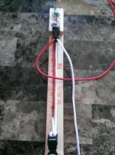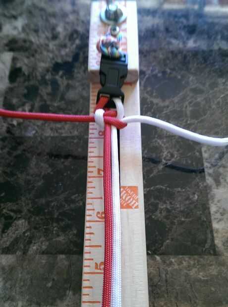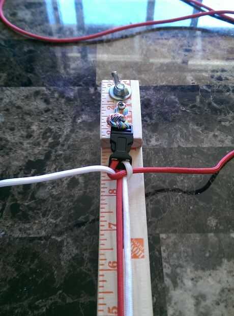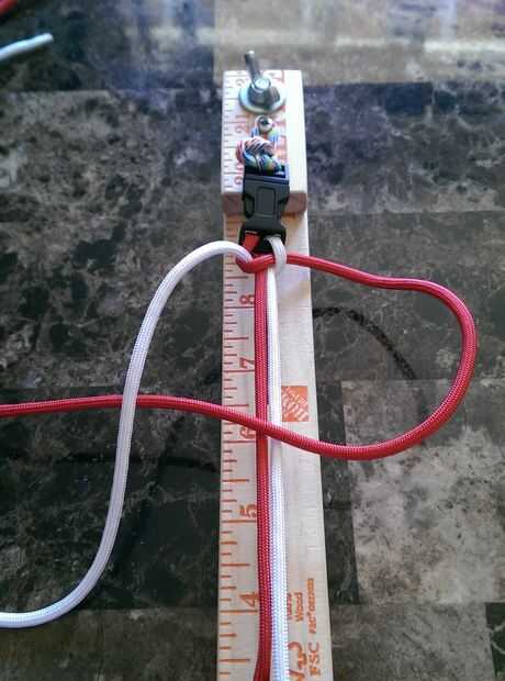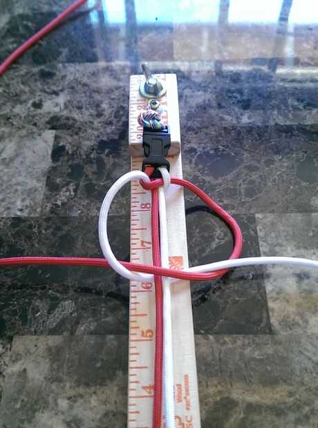 4. repetir 1-3 anterior. Las cuerdas han cambiado lados pero el orden de colores en las instrucciones mantiene igual. -Rojo sobre núcleo, blanco en base y en rojo, tirar cómodo.