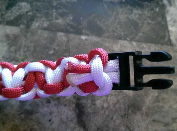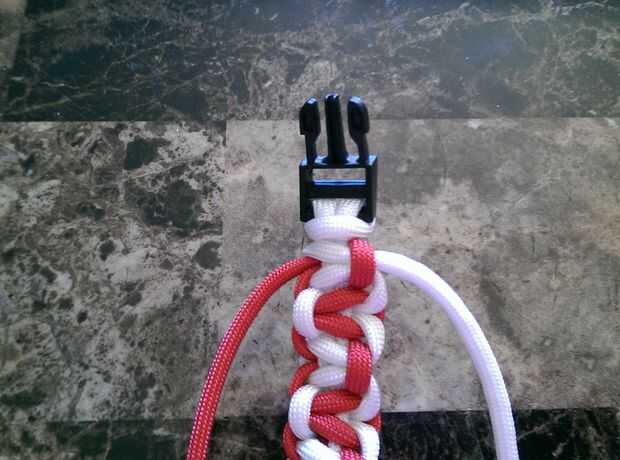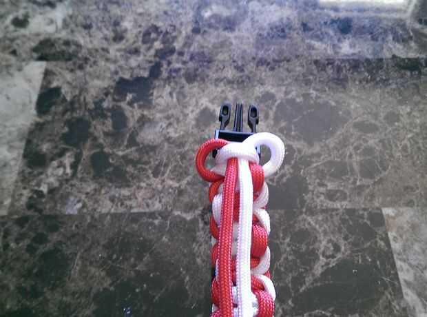 Siga los pasos 3 y 4 (dos nudos con excedente del rojo, dos nudos con blanco sobre) hasta llegar al final de la pulsera.