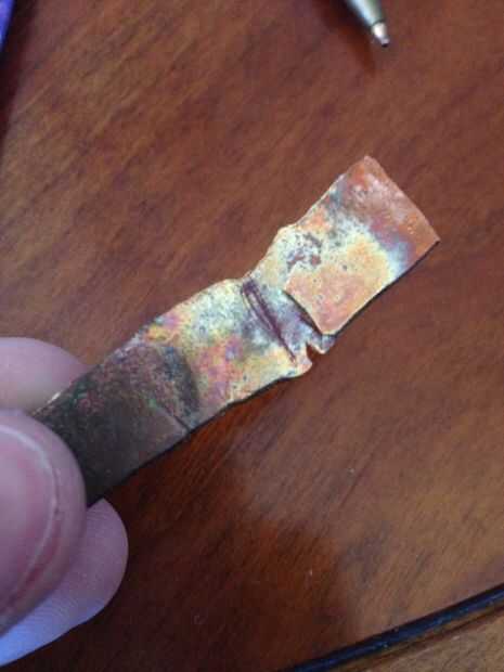 Coloque la chatarra de cobre en el lazo como se muestra y decidir que te gusta cómo se ve. A continuación, dibuje una marca donde el cobre sale de la corbata (será más tarde ser doblez aquí)