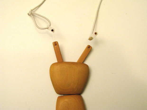 Las dos barras pequeñas de madera perforadas y talladas como se muestra pegada ligeramente al nudo con tornillos pequeños (perfore previamente las barras!). Arena el tornillo, por lo que no dañará la camiseta.
