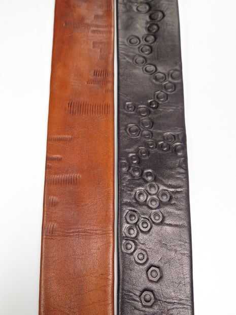 Para dar a los lazos de su mirada única, les sello con objetos ordinarios que he encontrado en nuestra tienda, en este caso literalmente usé tornillos y tuercas. Me gusto mucho tomar estos objetos fuera de su contexto habitual y utilizarlas para crear interesantes texturas. Usted podría utilizar cualquier número de objetos diferentes para hacer sus lazos único y personalizado, y averiguar lo que hará una buena marca es la mitad de la diversión. Por supuesto también podría utilizar sellos de cuero hecha de antemano como estos, que se pueden llegar a Tandy u otro cuero trabajo tiendas, o incluso crear tus propios sellos impresos 3D, como lo hice en este Instructable.