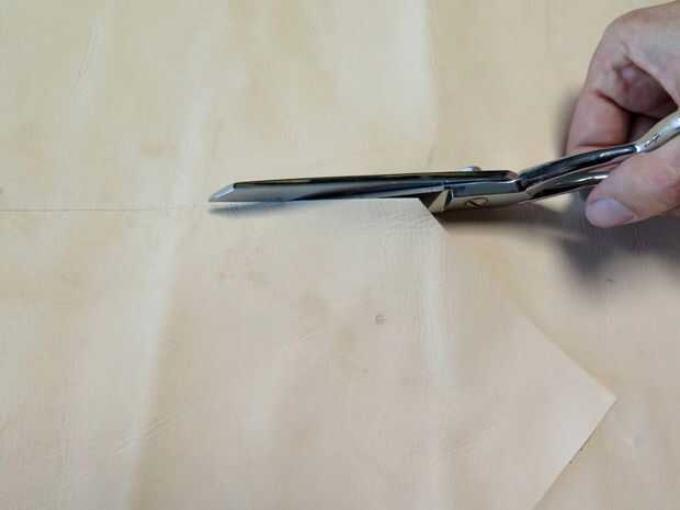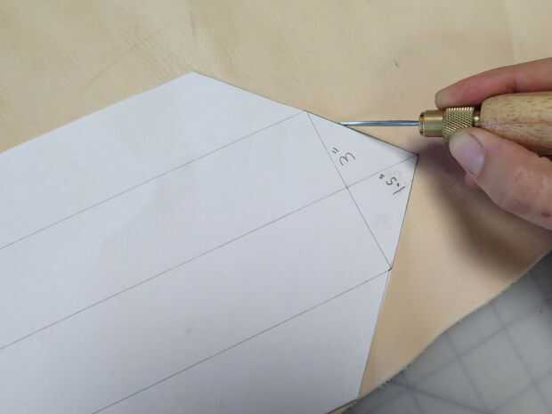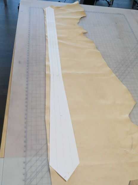 Coloqué mi patten tie en mi piel de verduras curtidas y había asegurado abajo con unos pequeños trozos de cinta. A continuación trazó la forma con una lezna rayado y recortar cuidadosamente con unas tijeras afiladas.