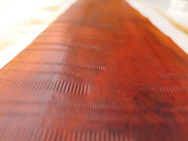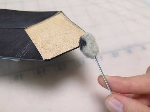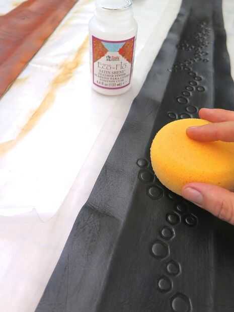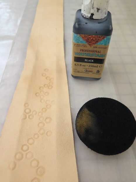 Pone mi piel fuera en papel de cera y utiliza una esponja para aplicar la una capa uniforme de tinte. Uso de guantes es una buena idea si no quieres teñir todo sus manos. También usé un dauber lana para teñir los bordes crudos en la parte inferior y parte superior de mis lazos.