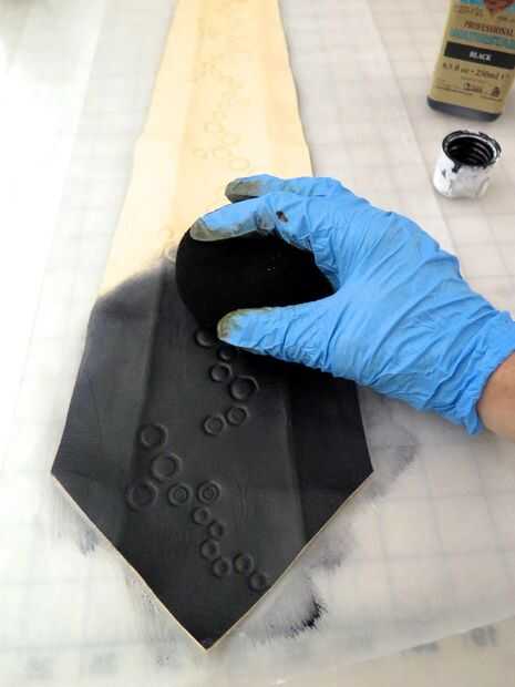 Para agregar color a mis diseños de corbata, usé un Waterstain Pro negro, manchas de todo-en-uno marrón bellota y un final en el otro.