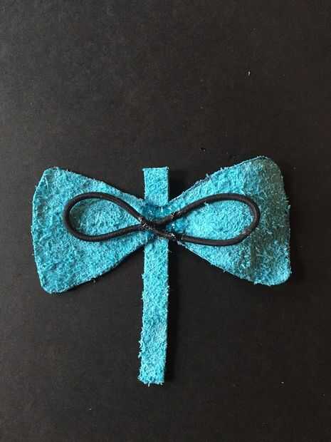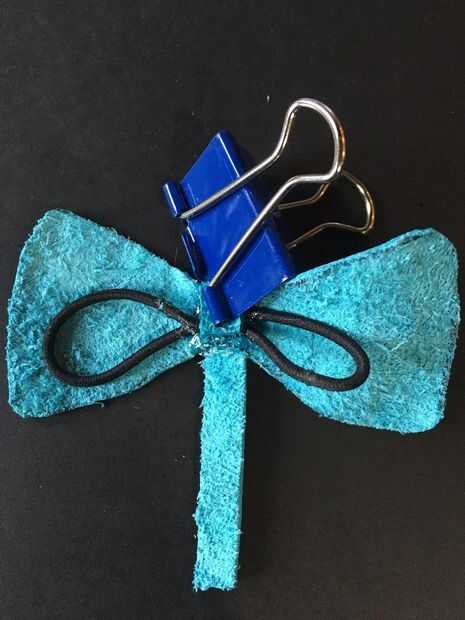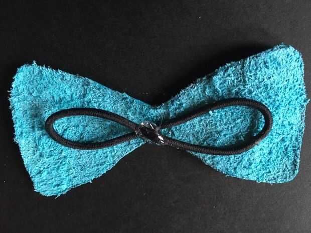 Deslice la tira delgada de cuero detrás de la proa y envuélvalo sobre el uso elástico, un clip de carpeta para unir las piezas mientras se seca el pegamento.