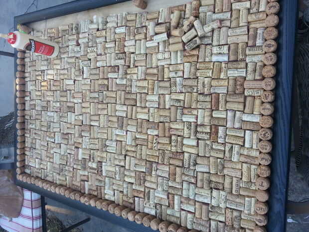 Comencé pegando abajo los corchos de champán alrededor del borde externo del marco. A continuación fui uno por uno y se pega cada corcho del vino para mi patrón.
