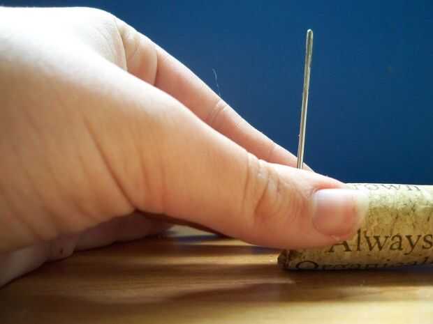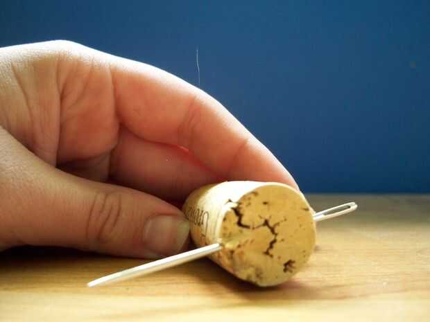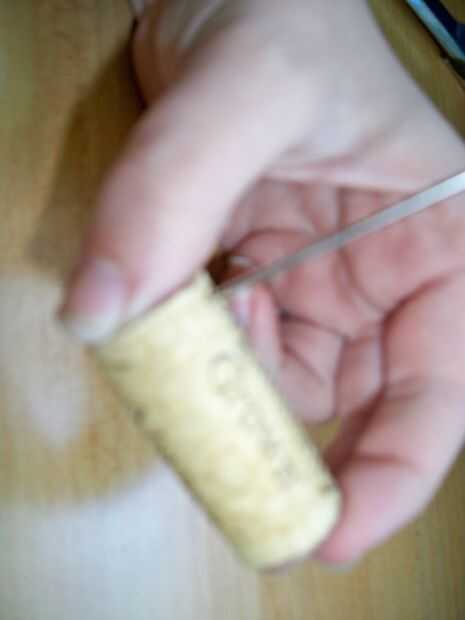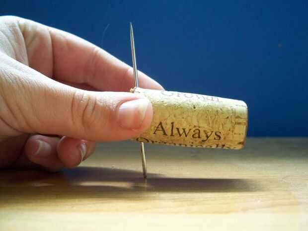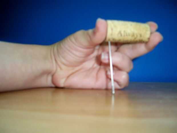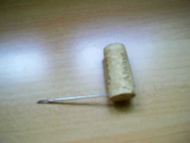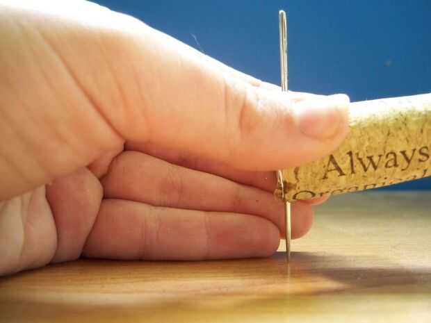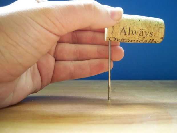 Meter un agujero en el corcho con la aguja. Supongo que también podía perforar un agujero, pero tenía que hacerlo en mi habitación con la puerta cerrada para que nadie sabría lo que estaba haciendo (es un recuerdo presente) y si corro había un taladro estoy seguro de que habría notado. Por lo tanto, colocar la aguja en un lado del corcho, asegúrese de que su derecho puede empujar hacia fuera la parte superior. Voltear a su lado para que la aguja esté en contacto con cualquier superficie que está trabajando. EMPUJE CUIDADOSAMENTE HACIA ABAJO EL CORCHO! Recuerde que la aguja va a salir el otro lado, así que no pongas el dedo allí. Cuando vea la aguja que sale del otro lado voltee el corcho y empuje hacia abajo otra vez (esto hará que un agujero minúsculo en la superficie que está trabajando así que asegúrese de que no lo hace en algo te importa mucho) hasta que la aguja quede alineada con el corcho. Saque la aguja. ESTO VA A SER DIFÍCIL! Quizás tenga que mover alrededor de algunos pero debe salir. RECUERDE QUE LAS AGUJAS SON AFILADAS! Si usted está teniendo apuro el conseguir de él hacia fuera, dejar a un lado y espere un rato, si sigues intentando mientras frustrado (confía en mí sus agravantes) se perjudican a sí mismo. Así que solo ponlo hacia abajo y a pie. Volver más tarde y te asomen justo.
