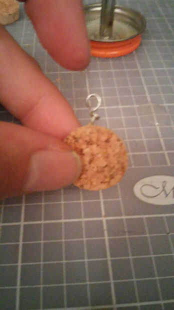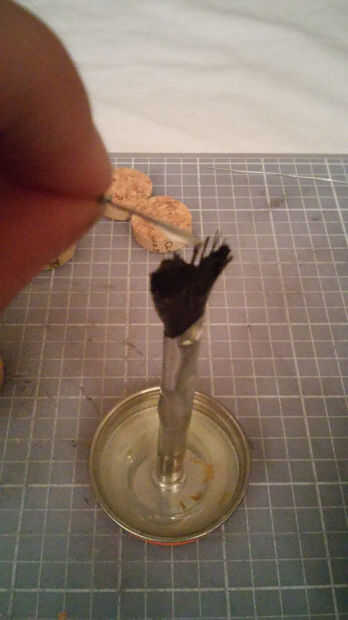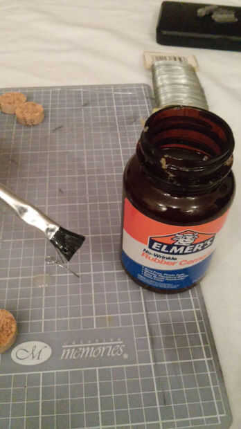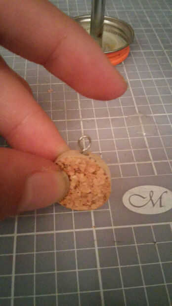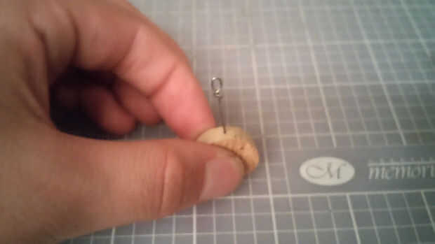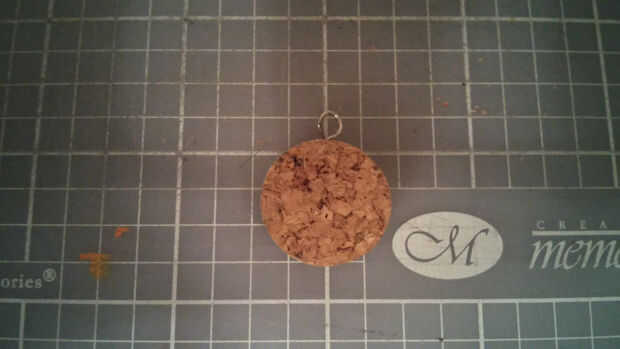 1. Pegue la punta del alambre en el corcho -puede ser necesario perforar un orificio piloto para este paso. No lo hice y tardaron un poco más de tiempo para trabajar el alambre en el corcho. El bucle del cable debe terminar a ras con el borde del corcho