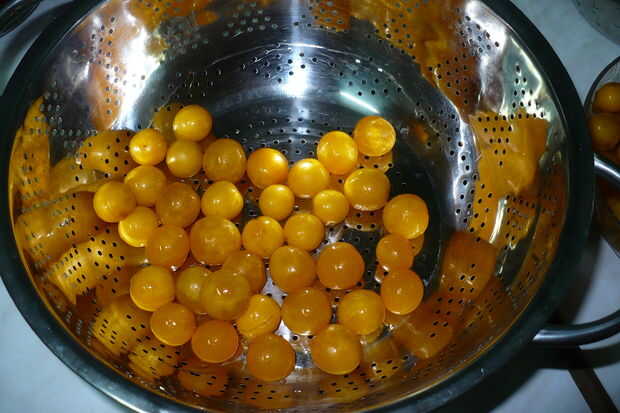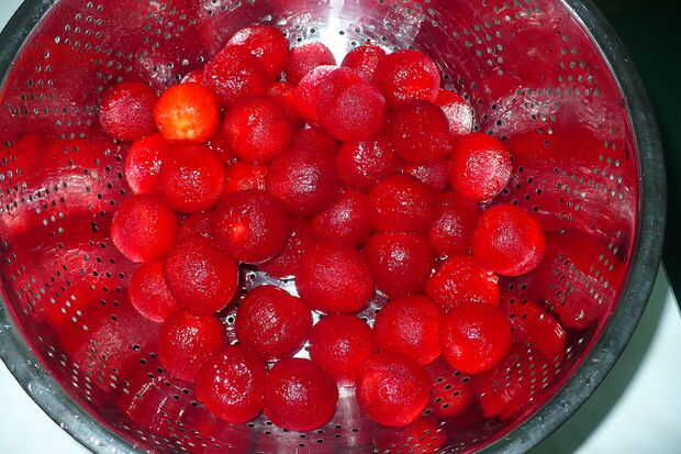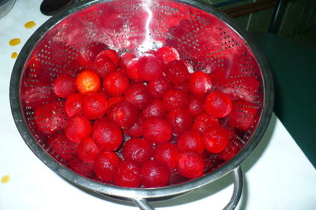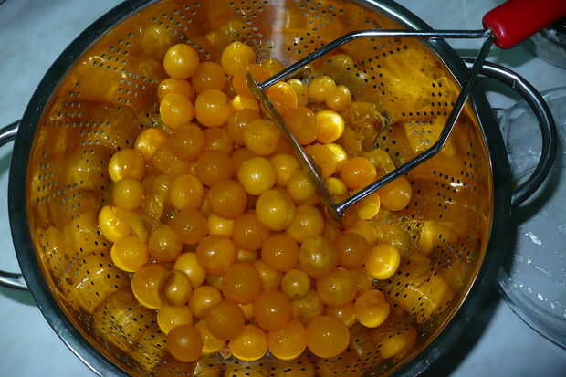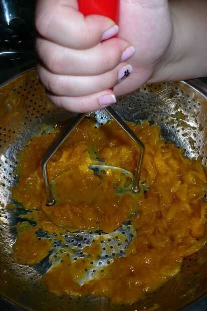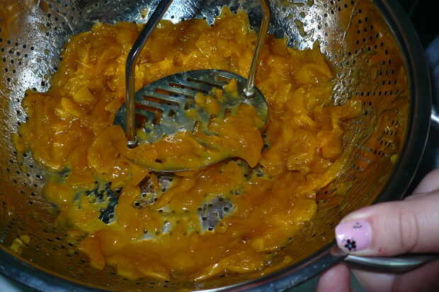 Poner las frutas en un colador de pasta (esperanza es la palabra correcta, pero se puede ver en la imagen lo que quiero decir) y les. La fruta pasa a través de los orificios y quedará con las semillas.