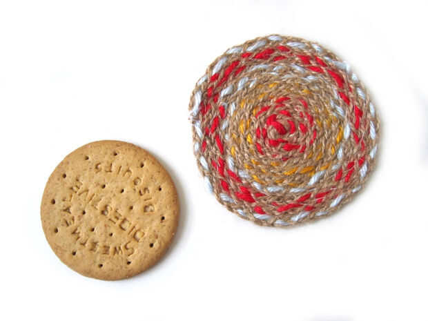 Yo quería hacer un proyecto completamente fuera de la cadena, y pensé en cestas y hamacas y cojines de la taza! Mi cadena de pensamiento llegó inspirado en las alfombras de trapo pasado de moda que se han vuelto tan populares últimamente, y nacieron estos cojines de la taza de guita del yute. Mi idea era utilizar sólo de cadenas, y creo que logré, hilos, hilados y cordeles de yute!