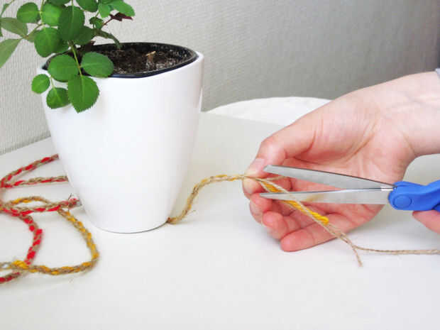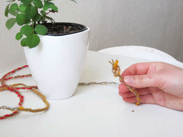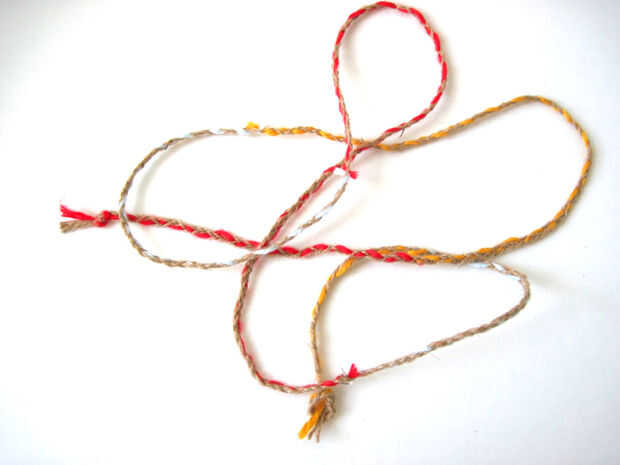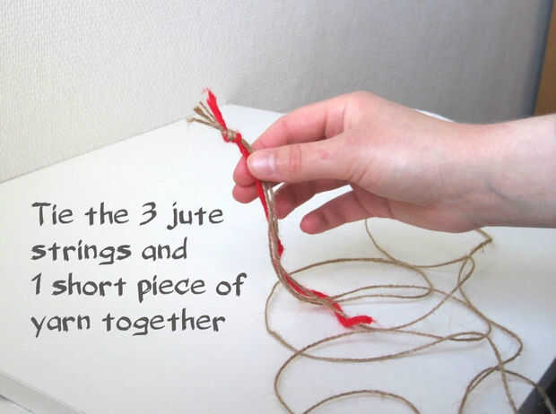 Medir a tres longitudes de cuerda de yute, cada uno de aproximadamente 2 m de largo. Ate los extremos en un nudo con un pedazo corto de hilo de color.