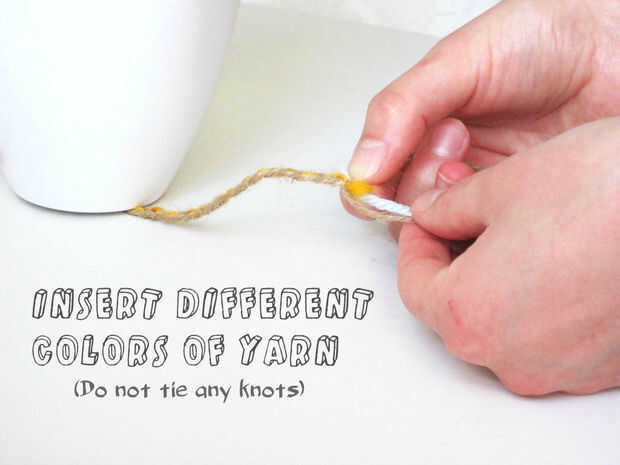 Cuando la primera pieza de hilo se utiliza para arriba, poner otro hilo de color en su lugar para que los extremos de los dos colores se superponen un poco. No ate los nudos pero continuar trenzado con la nueva pieza del hilado junto a una de las cuerdas de yute.