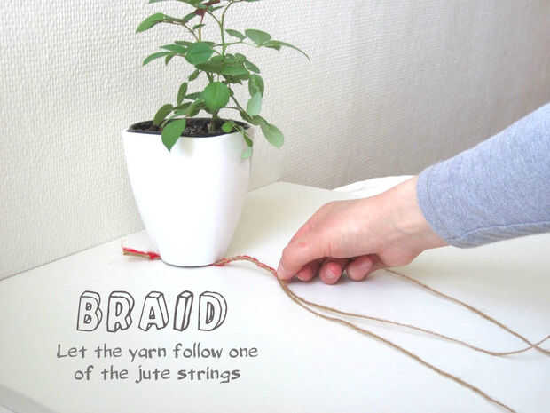 Iniciar el trenzado, permitiendo el seguimiento del hilo una de las cuerdas de yute. Esto creará una trenza desigual con toques de color en ella.