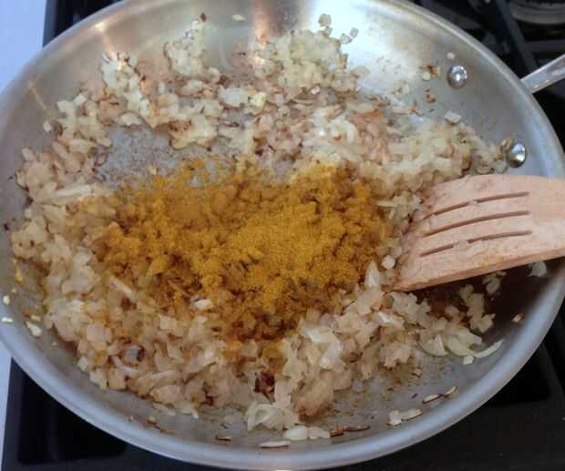 Agregue 2 cucharadas de su favorito de curry en polvo y revolver hasta que se mezcle bien. Si empieza a pegar o quemar, añadir más grasa.